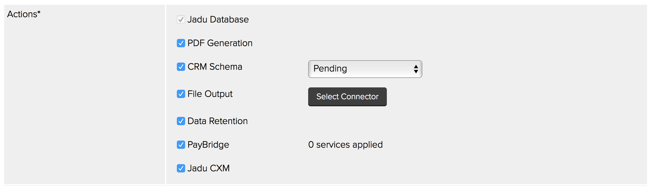 - Payments: If the Jadu PayBridge or the legacy ePayments module is implemented within your Jadu platform, this Action allows the integration of a form with a Payment Service Provider (PSP). This Action is optional and disabled by default.